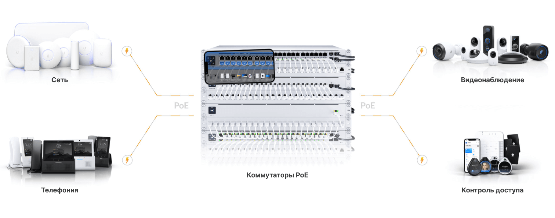 - UniFi Access: Современная система контроля доступа, поддерживающая традиционные электрозамки, магнитные замки и 12В аксессуары для контроля доступа, такие как датчики движения, кнопки и сигнализации. Позволяет легко управлять пользователями, посетителями, графиками и правилами доступа.